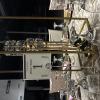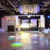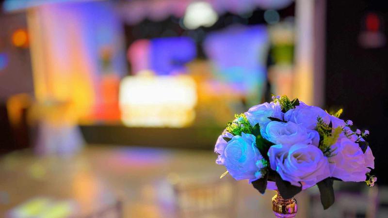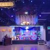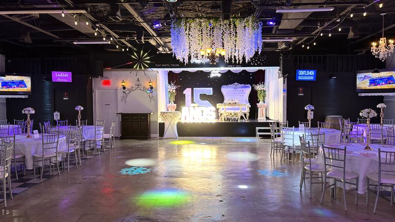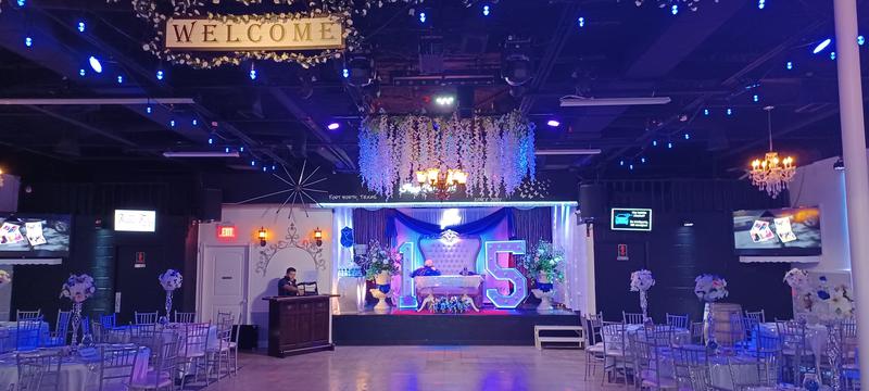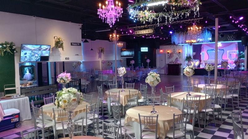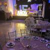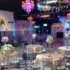 -Salón con mesas redondas, sillas elegantes tipo Chiavari y decorado con candelabros, tela (Ceiling Draping), luces ambientales y luces neón.