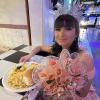 -Salón con mesas redondas, sillas elegantes tipo Chiavari y decorado con candelabros, tela (Ceiling Draping) y luces ambientales y luces neón.